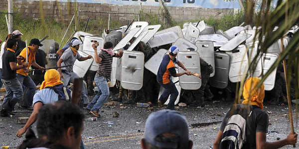 Miles de hondureños se encuentran en las calles protestando por el Golpe de Estado en su país. Éstos han sido recibidos con gases lacrimógenos, balas de goma anti-motín, tanques disparando una mezcla de agua con químicos, y macanas. La policía se ha desplazado a romper las barricadas y los militares en hacer retroceder a los manifestantes de la casa presidencial, dejando un número desconocido de heridos.