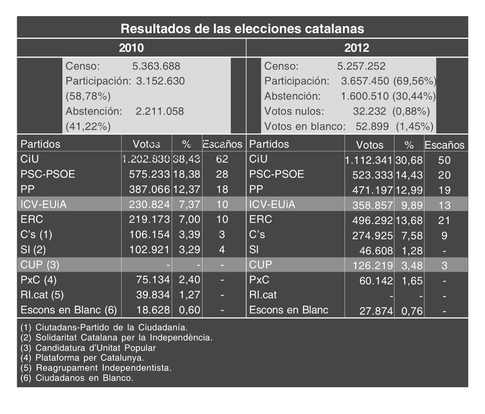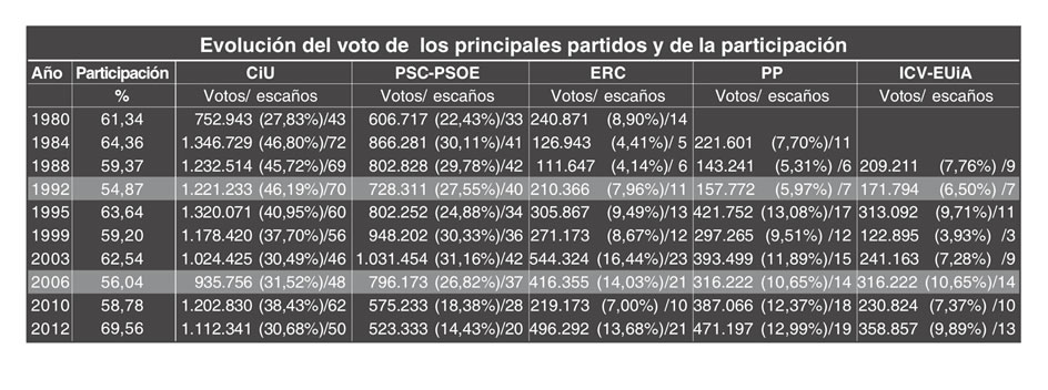 CiU pierde unos 100.000 votos (casi 8 puntos) y 12 escaños. Muy lejos de lo esperado y, desde ese ángulo, un fracaso. Aun así es la primera fuerza, con diferencia, en relación con la segunda (ERC), a la que saca 29 escaños. CiU ha sido siempre la primera fuerza en escaños y en número de votos en las diez convocatorias habidas. Y ha estado al frente de la Generalitat, salvo en los periodos 2003-2006 y 2006-2010, en los que gobernaba el PSC en alianza con ERC e ICV. Entre los tres partidos sumaron 74 y 72 escaños, mientras que CiU solo alcanzaba 46 y 48. CiU consiguió la mayoría absoluta en tres ocasiones (1984, 1988 y 1992).