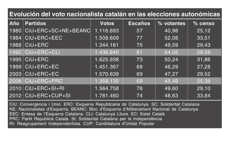 Hay que destacar que en las elecciones del 25-N, los resultados de las cuatro formaciones nacionalistas que se presentaban se quedan por debajo de la mitad de los votos emitidos (el 48,63%), un punto menos que en las de 2010. Por otro lado, los votos obtenidos (1.781.460) representan solo algo más del 33% de los electores censados (4,7 puntos más que en 2010). Todo ello teniendo en cuenta que la participación se aproximó al 70%, la más alta de las diez convocatorias electorales registradas hasta la fecha. Por su parte, las formaciones que no se declaran nacionalistas y que logran diputados en estas elecciones (PSC, PP, ICV-EUiA y C’s) suman 1.628.312 votos (el 44,45% de los emitidos y casi el 31% del censo), 329.000 votos más que en las de 2010 y también un 3,27 más en porcentaje.